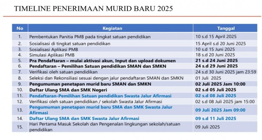 JADWAL PELAKSANAAN: Sosialisasi SPMB : 15 April s.d 20 Juni 2025 Pra Pendaftaran (Aktivasi Akun, Input dan Upload dokumen) : 21 s.d 24 Juni 2025 Pendaftaran / Pemilihan S
